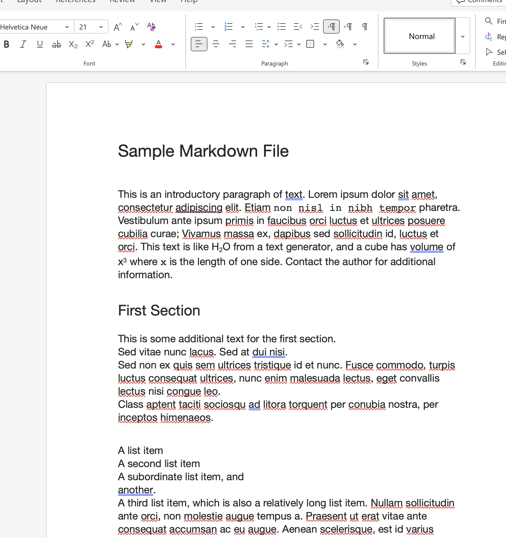 How much of the formatting shown in Marked 2's preview should I expect to see retained when I export to DOCX format? I have a sample MD file with lots of formatting ranging from the basics (headings, lists, bold, italics, links) to some of the more advanced (a table, a footnote, code block, blockquote). When I print or export to PDF, the generated file seems as expected. When I export to DOCX, however, all of the text is there but very little formatting is retained when I open the generated file in MS Word.